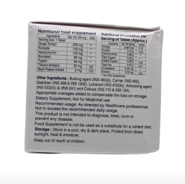 Trypsin, bromelain are proteins with anti-inflammatory properties. They help to reduce pain, swelling and irritation by increasing blood supply to the affected area. Rutoside has antioxidant and anti-inflammatory properties. Ginger extract, nanocurcumin and black pepper extract are rich with antioxidants that helps to protect the cells from free radical damage.