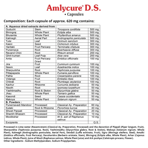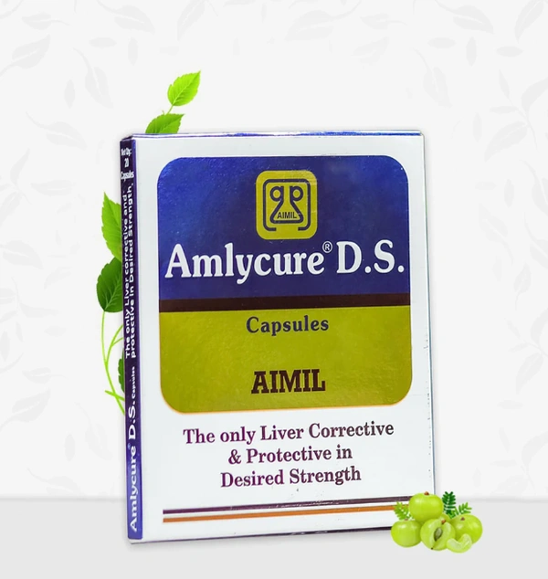 Amlycure D.S. Capsules are an Ayurvedic formulation designed to support liver health, improve digestion, and enhance metabolism. They contain a blend of hepatoprotective (liver-protecting) herbs that help detoxify the liver, regulate liver enzymes, and support overall digestive well-being.