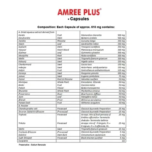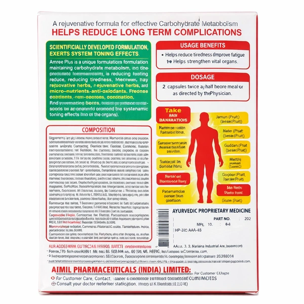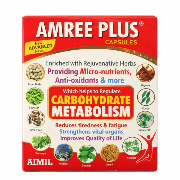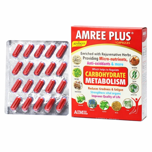Amree Plus is a comprehensive Ayurvedic formulation designed to support healthy carbohydrate metabolism and assist in the management of diabetes mellitus. It combines a synergistic blend of vital herbs traditionally used to regulate blood sugar levels, enhance insulin function, and improve overall energy and vitality.