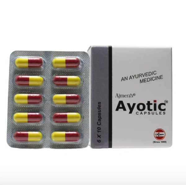 Ayotic Capsules by Ajmera Pharmaceuticals are a proprietary Ayurvedic formulation designed to combat various fungal and bacterial infections. This herbal blend aims to balance the body's doshas, particularly Pitta and Vata, promoting overall health and resilience against infections.
