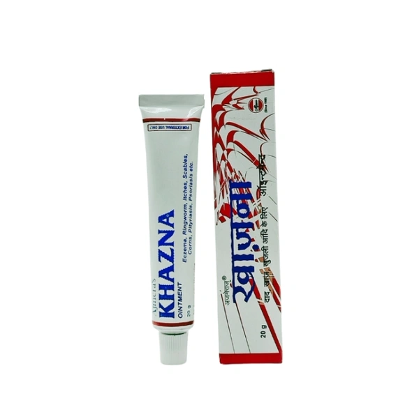 Khazna Ointment by Ajmera Pharmaceuticals is a proprietary Ayurvedic formulation designed to treat various skin conditions, including ringworm, eczema, dermatitis, scabies, foot itch, and parasitic skin infections.