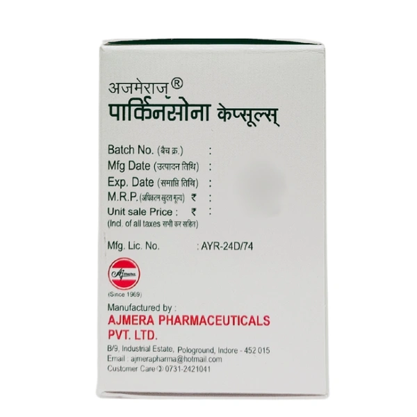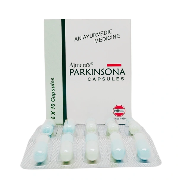 Parkinsona Capsules by Ajmera Pharmaceuticals are an Ayurvedic herbal formulation designed to support individuals experiencing neurological disorders, particularly those associated with aging, such as Parkinson's disease.