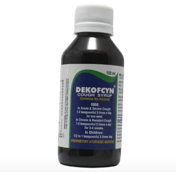 Dekofcyn Syrup is an Ayurvedic cough remedy formulated with natural herbs that provide relief from dry and productive coughs. It soothes throat irritation, reduces congestion, and enhances respiratory health.