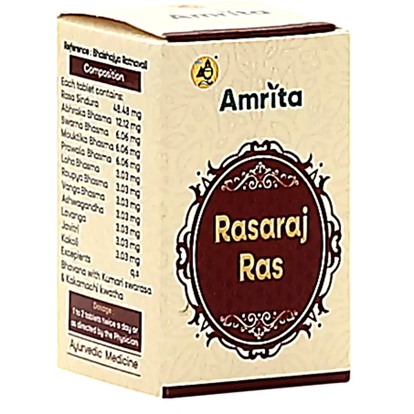 Amrita Rasraj Ras (Ref: Siddha Yoga Samgraha) is an Ayurvedic forumlation that helps in the treatment of meuro-muscular disorders like paralysis, Hemiplegia, Lockedjaw, facial palsy and other disorders caused by Vata imbalance in the body. Its primary function is to help strengthen the nerves and muscles.