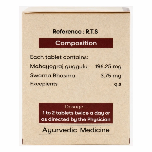This is a classical Ayurvedic medicine formulated as per R.T.S. reference, containing Mahayograj Guggulu and Swarna Bhasma. The formulation is traditionally used in Ayurveda to support joint comfort, musculoskeletal strength, and overall vitality. Prepared using time-tested Ayurvedic processes, it is intended to be used under the guidance of a qualified physician. Suitable for individuals seeking Ayurvedic support for daily wellness and balance.