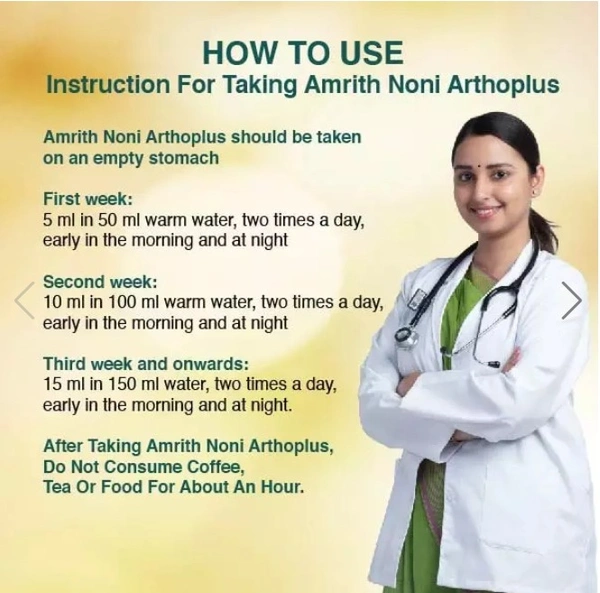 - Amrith Noni Arthoplus should be taken on an empty stomach early in the morning and one hour before food at night.