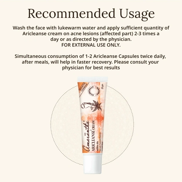 Aricleanse Cream is an Ayurvedic formulation designed to support skin health, particularly in managing acne and related concerns. It combines natural ingredients known for their skin-soothing and antimicrobial properties, aiming to reduce acne lesions and improve overall skin texture.