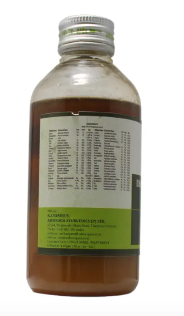 K.S. Varier's Ashtanga Ayurvedics offers Dhanwantharam Kuzhambu in a 200 ml bottle, priced at ₹210.00.