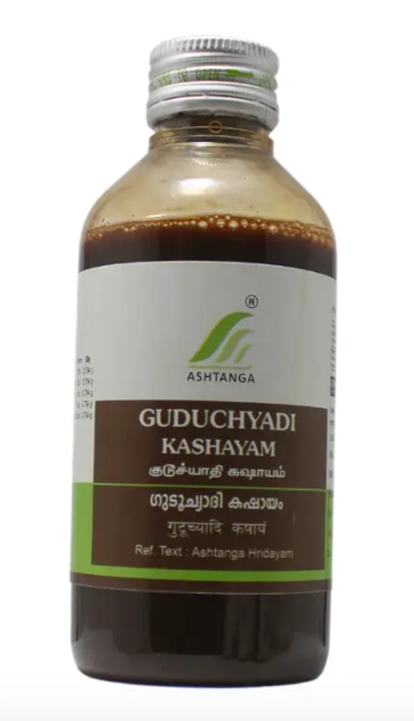Guduchyadi Kashayam is an Ayurvedic formulation known for its immunomodulatory, antibacterial, anti-inflammatory, and antiviral properties. It is commonly used to balance Vata and Kapha doshas, and to manage various fevers and allergic conditions.
