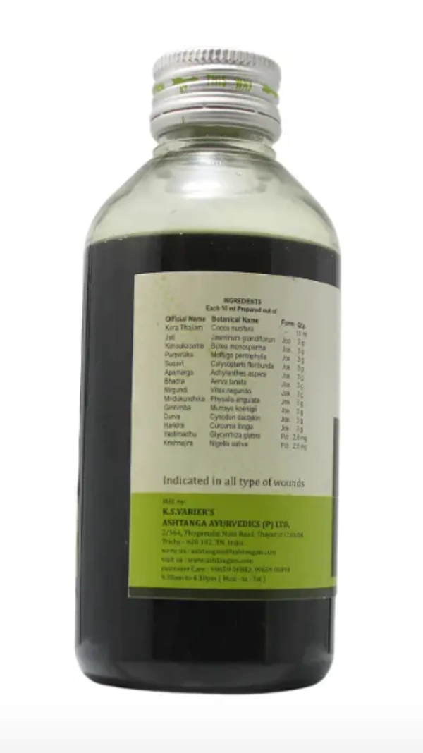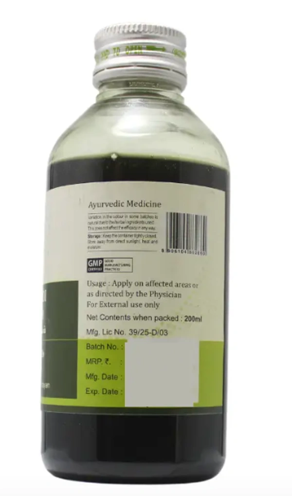Jathyadi Thailam is an Ayurvedic herbal oil traditionally used for promoting healthy skin and aiding in the healing of wounds, burns, abscesses, mouth ulcers, eczema, and other skin conditions. Its formulation includes ingredients like jasmine (Jati), neem (Nimba), and turmeric (Haridra), known for their antimicrobial and anti-inflammatory properties.