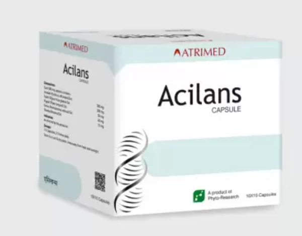 Acilans Capsule is an Ayurvedic formulation by Atrimed Pharmaceuticals, designed to address gastrointestinal disorders such as gastritis, peptic ulcers, and acid reflux. It works by reducing inflammation in the stomach lining, neutralizing excess acid, and promoting healing of ulcers. It is also effective in managing Helicobacter pylori infections.