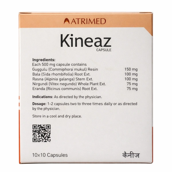 Kineaz Capsule is an Ayurvedic supplement formulated to manage joint pain, inflammation, and stiffness. It supports joint health, enhances mobility, and is particularly beneficial for conditions like arthritis and back pain.