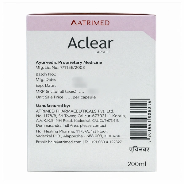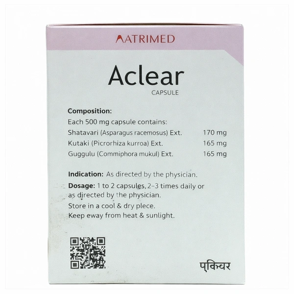 Aclear Capsule is an Ayurvedic formulation developed to address skin-related concerns such as acne, blemishes, and hyperpigmentation. It works by detoxifying the blood, reducing inflammation, and balancing Pitta dosha, promoting clear and healthy skin.