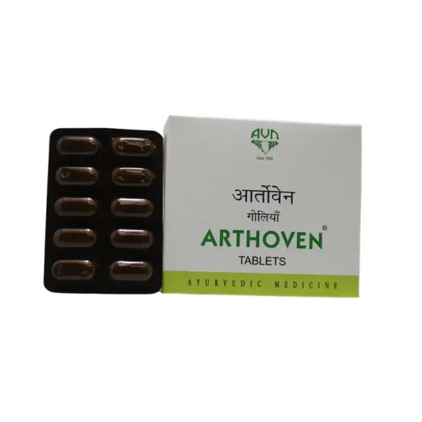 Arthoven Tablet is an Ayurvedic herbal supplement designed to manage arthritis and autoimmune conditions such as rheumatoid arthritis, gout, and ankylosing spondylitis. It reduces swelling, pain, and stiffness in joints and promotes overall joint health.