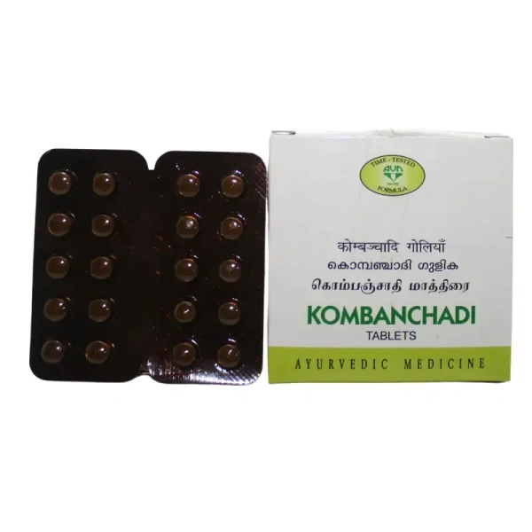 Kombanchadi Tablet (20 Tabs) – AVN Ayurveda Product Overview: Kombanchadi Tablet is an Ayurvedic formulation designed to alleviate common cold, cough, and fever in children. It combines herbs known for their antipyretic and expectorant properties, providing relief from respiratory discomfort. Key Ingredients: