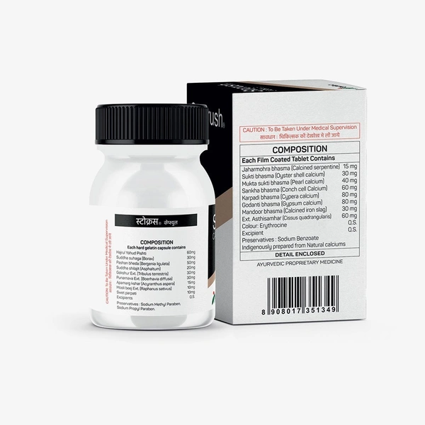 Stocrush capsule is an exclusive herbo-mineral formulation to treat and prevent urinary tract infection and stone formation. Stocrush capsule is a diuretic that flushes out small stones from the kidneys. Stocrush capsule normalizes urinary pH and alleviates burning during urination. Flushes out with strong diuretic action. Provides symptomatic relief by acting as alkalizer. anti-spasmodic and anti-inflammatory. Maintains alkaline of urine.
