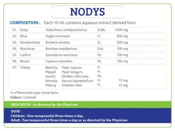 Nodys Syrup by Ayurchem is a powerful Ayurvedic remedy specifically formulated to target gastrointestinal issues such as acute abdominal pain and diarrhea. This syrup works by alleviating mucosal irritability, reducing stool frequency, and relieving discomfort associated with abdominal distress. By promoting the balance of healthy gut flora, it helps control infections and enhances digestive health. Ideal for both acute and chronic conditions, Nodys Syrup provides natural support for gastrointestinal well-being, making it an essential part of digestive care.