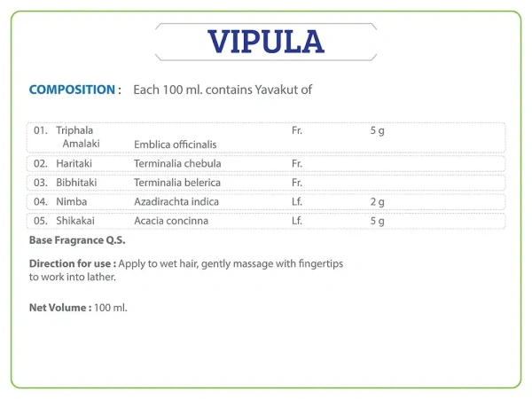 Vipula Anti-Dandruff Hair Lotion is a potent Ayurvedic hair wash designed to eliminate dandruff, reduce scalp irritation, and maintain scalp health. Formulated with a blend of natural herbs, it relieves itchiness and flakiness, balances scalp oil production, and promotes healthy hair growth. It effectively removes dirt and excess oils, while also conditioning the hair. Regular use helps in preventing hair fall, making hair soft, shiny, and beautiful.