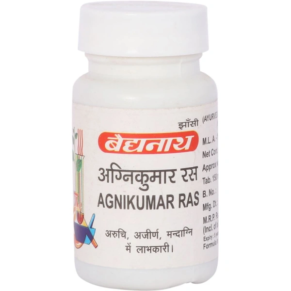 Baidyanath Agnikumar Ras Tablet is a classical Ayurvedic formulation designed to enhance digestive fire (Agni) and support gastrointestinal health. It is beneficial in managing indigestion, loss of appetite, bloating, and sluggish digestion caused by weak digestive power. Referenced in Bhaishajya Ratnavali, this herbomineral formulation is composed of purified minerals and potent herbs that help regulate metabolism and alleviate discomfort related to indigestion. The presence of Maricha (Black Pepper) gives it a hot potency, making it ideal for Kapha and Vata-dominant digestive disorders, but it should be used cautiously in individuals with excess Pitta to avoid acidity or burning sensations.