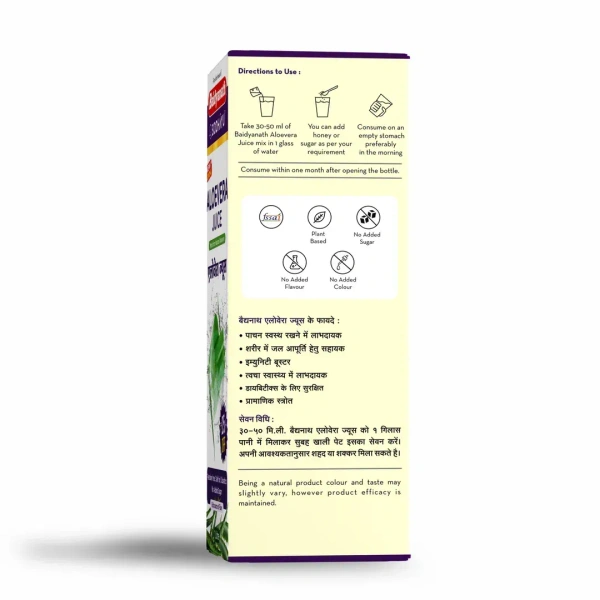 Take 30-40 ml of Baidyanath Aloevera juice mix in 1 glass of water preferably empty stomach in morning. You can add Honey/Sugar as per your requirement. Consume within one month after opening the bottle.