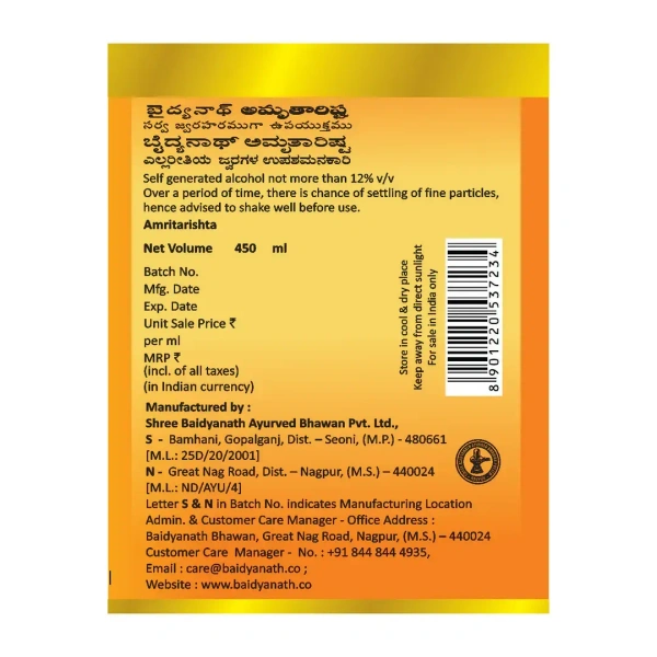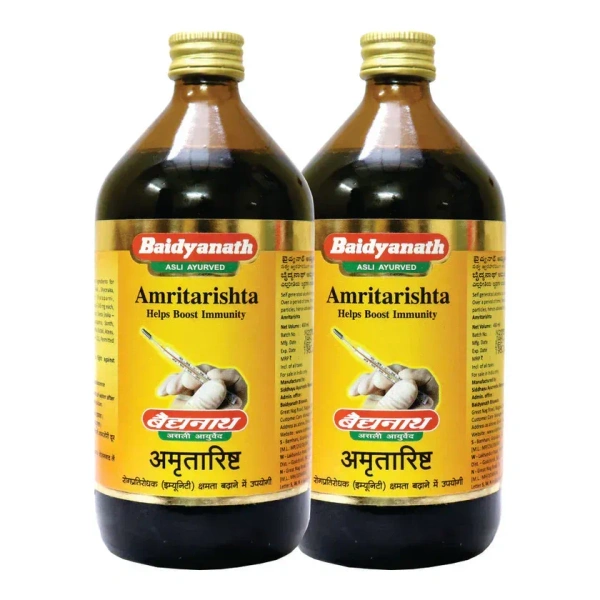 Baidyanath Amritarishta is an effective immune boosting ayurvedic, fermented liquid preparation. It contains over 5 percent of alcohol that is self generated in the preparation over a period of time. This self generated alcohol and the water acts as media to deliver water and alcohol soluble active herbal components to the body effectively. It helps the body combat bacteria, viruses, and other germs and boost immunity.