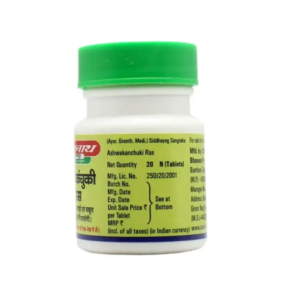 Baidyanath Ashwakanchuki Ras is an Ayurvedic herbomineral formulation that is widely used in the treatment of various ailments, including body pain, respiratory issues, fever, and digestive discomfort. This powerful formulation is composed of natural ingredients and is particularly effective in treating cough, cold, bronchitis, asthma, and wheezing. Additionally, it helps in addressing fever-related issues and is beneficial in managing health conditions caused by aggravated kapha dosha. It is not recommended for conditions caused by pitta dosha, as it may worsen the symptoms. Known for its medicinal properties, this tablet can be an effective part of a holistic treatment plan.