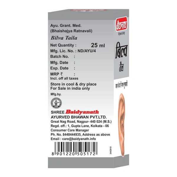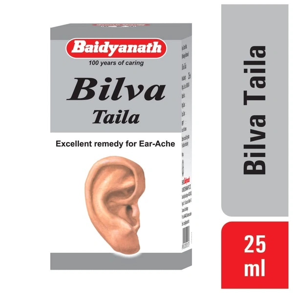 Baidyanath Bilva Taila is a specially formulated Ayurvedic oil that is highly effective in treating various ear-related disorders. Made with a blend of traditional ingredients like Bilva (Aegle marmelos), Goat's Milk, Gomutra (cow urine), and Til Tel (sesame oil), this oil works to provide relief from earaches, otitis media, and even hearing difficulties. Bilva, known for its anti-inflammatory and analgesic properties, is the key ingredient that helps reduce ear inflammation and treats infections. Regular use of this oil aids in maintaining overall ear health and can be beneficial for relieving pain and promoting hearing.
