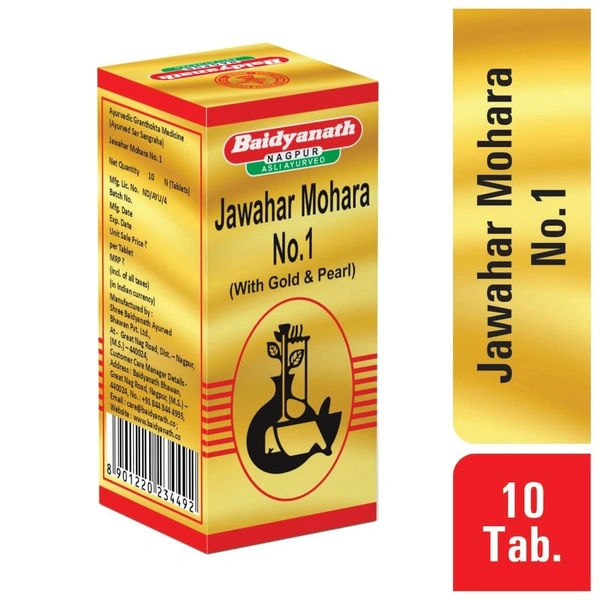 Baidyanath Jawahar Mohra No. 1 with Gold Tablet is a classical Ayurvedic formulation designed to support heart and brain health. Enriched with potent ingredients like gold and precious minerals, this herbal medicine helps nourish the heart, strengthen brain functions, and improve blood circulation. It is traditionally used to support cardiovascular health, relieve stress, and promote overall well-being by enhancing the functioning of the nervous system.