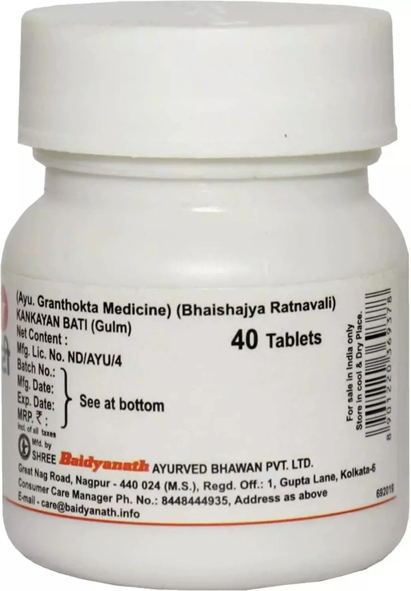 Kankayan Bati (Gulm) by Baidyanath is an Ayurvedic tablet specifically designed to address gulma roga – a condition characterized by localized abdominal tumours, lumps, or swellings. It is a potent formulation that acts as a gastric stimulant and laxative, offering relief from abdominal discomfort, bloating, and constipation. Additionally, Kankayan Bati helps manage both bleeding and non-bleeding types of gulma, supporting overall digestive health and alleviating symptoms associated with abdominal swelling.