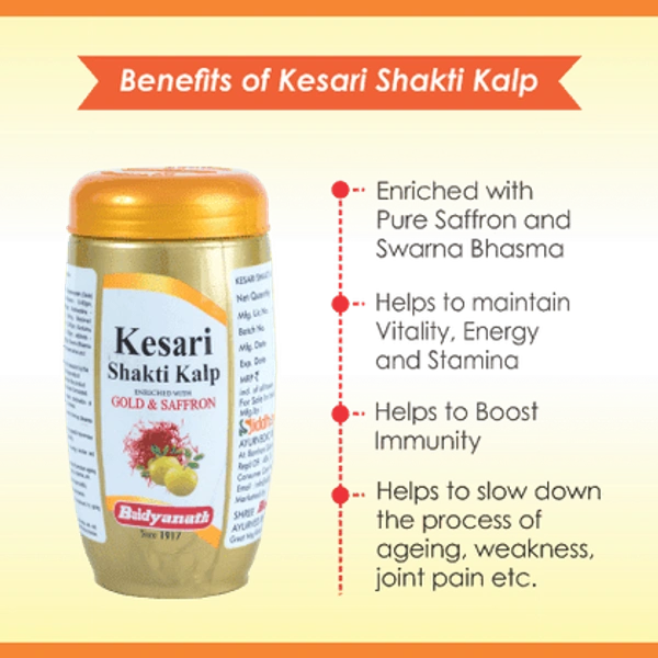 Baidyanath Kesari Shakti Kalp is a premium variant of chyawanprash with unique research formula and excellent ayurvedic tonic formulated with the combination of rare herbs. Enriched with natural vitamins and minerals with goodness of Gold and Saffron.