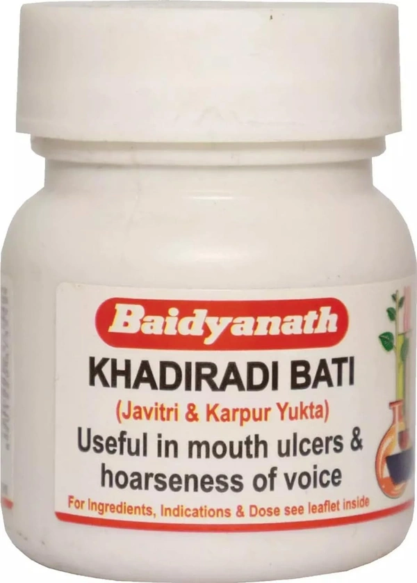 Baidyanath Khadiradi Bati is a potent Ayurvedic remedy formulated to treat diseases related to the mouth, throat, tongue, and stomach. It is particularly effective in relieving hoarseness of voice and addressing various oral health concerns, such as mouth ulcers and dental issues. The herbal composition of this medicine acts as an oral antiseptic, anti-inflammatory, astringent, and expectorant, making it a useful remedy for sore throat, tonsillitis, throat irritation, and dry cough.