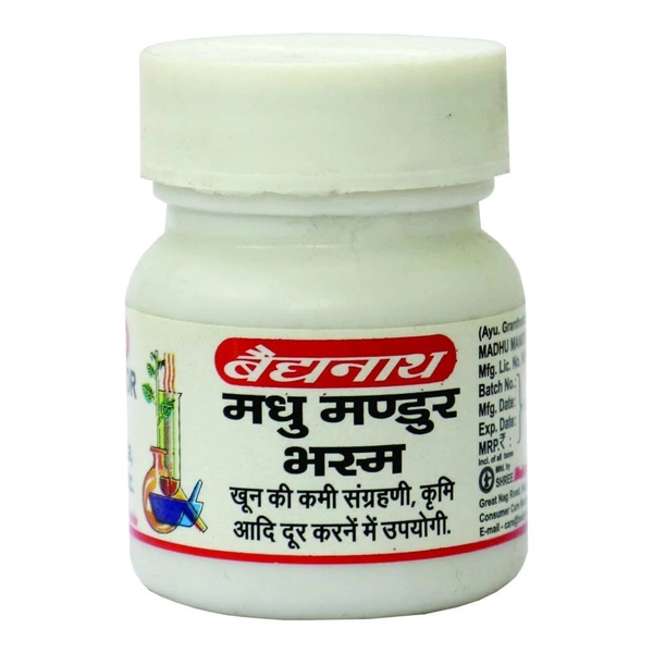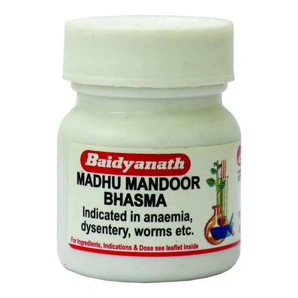 Baidyanath Madhumandoor Bhasma is a potent Ayurvedic formulation known for its effectiveness in managing anaemia, jaundice, liver disorders, and general debility. It is more powerful than traditional Mandoor Bhasma, as it is fortified with herbal decoctions and Panchamrita churna. This iron-rich preparation supports healthy blood formation, improves liver function, and enhances overall vitality. With a blend of purified iron, Triphala, and detoxifying herbs, it helps in reducing bilirubin levels, improving digestion, and boosting immunity.