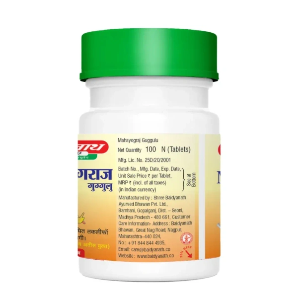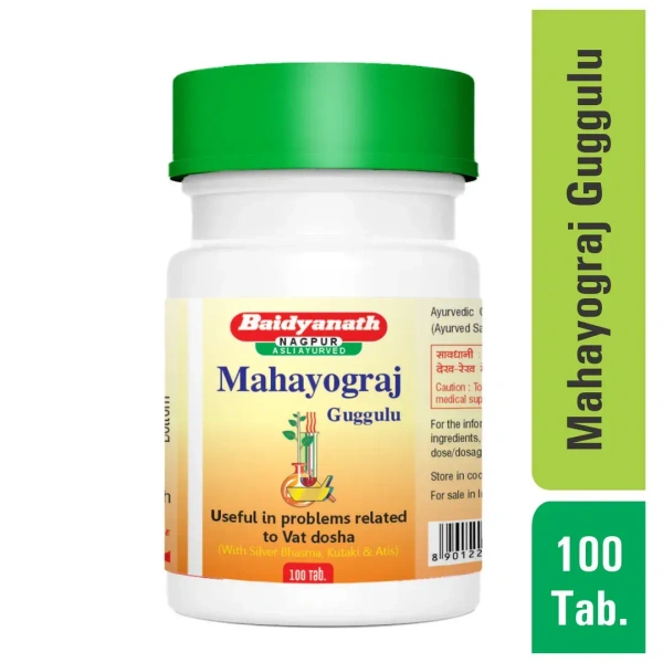 Baidyanath Mahayograj Guggulu is a traditional Ayurvedic herbomineral formulation that has long been used to treat chronic vat illnesses. The formula contains a synergistic blend of detoxifying herbs that work in tandem with Guggulu to alleviate joint, muscular, and nerve problems caused by aggravated Vata dosha. The use of valuable bhasma increases the efficacy of Mahayograj Guggulu. Chronic vat illnesses, gout, ligament pain, and other conditions are treated with Mahayograj Guggulu.