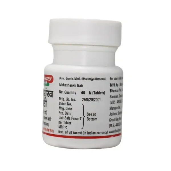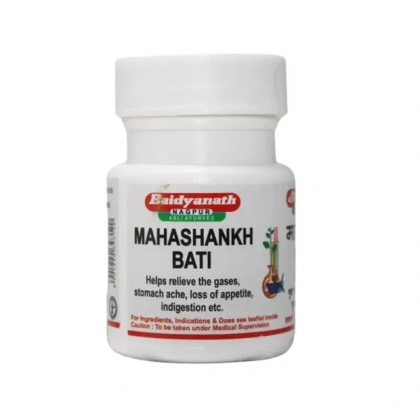 Baidyanath Mahashankh Bati is a herbal Ayurvedic formulation designed to aid in digestive health by relieving indigestion, gas, and stomach discomfort. It acts as a carminative and stomachic, helping improve appetite and digestive function. Traditionally used in Ayurveda, this powerful remedy is beneficial for abdominal pain, gastritis, piles, and intestinal issues. It contains herbal salts, spices, and mineral preparations, which work together to support gut health and overall digestion.