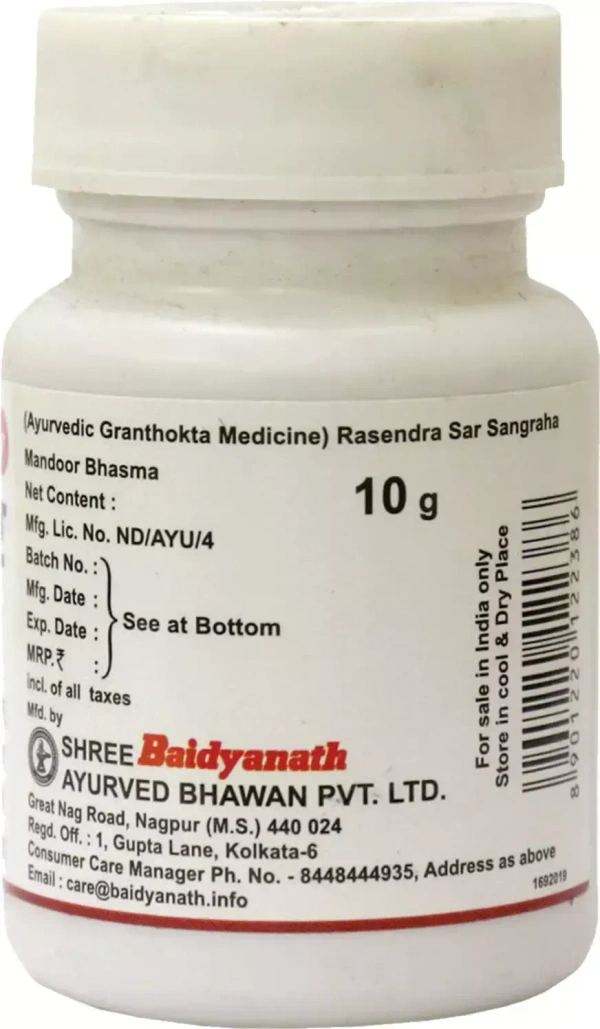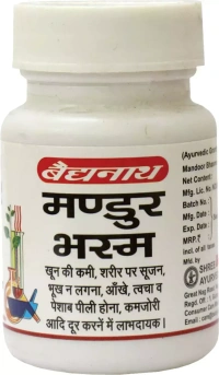 Baidyanath Mandoor Bhasma (10 gm) is a classical Ayurvedic formulation used primarily for its therapeutic effects on anemia, digestive health, and detoxification. It is an Ayurvedic iron supplement that helps in improving hemoglobin levels and treating conditions related to iron deficiency.