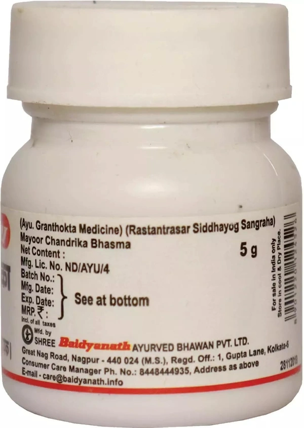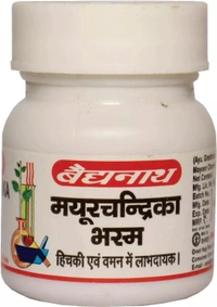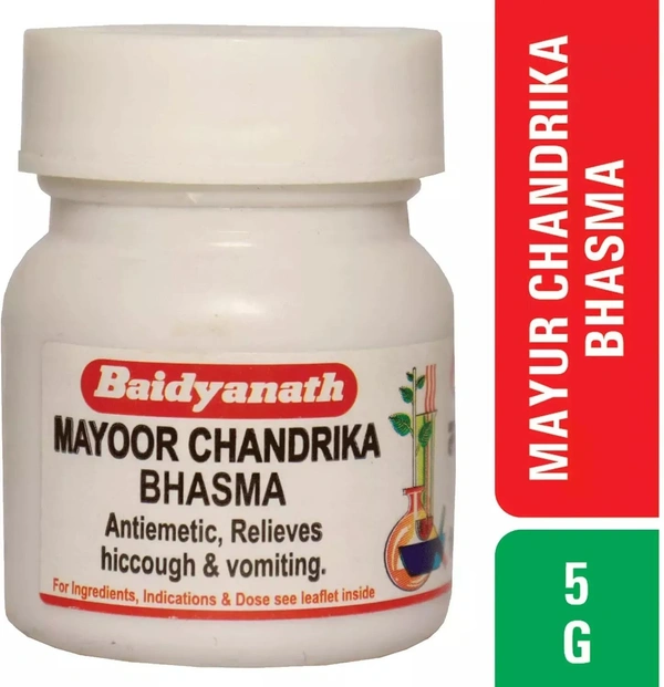 Mayur-Chandrika Bhasma is a classical Ayurvedic formulation known for its remarkable antiemetic (anti-nausea) and antispasmodic properties. It is prepared from peacock feathers (Pavo cristatus), processed with cow's ghee (clarified butter), making it an effective remedy for a variety of respiratory disorders, such as cough and asthma. It is also well-known for its ability to combat nausea and vomiting and can help prevent hiccups. This unique preparation harnesses the power of peacock feathers, rich in natural compounds, along with several vital minerals that support overall well-being.