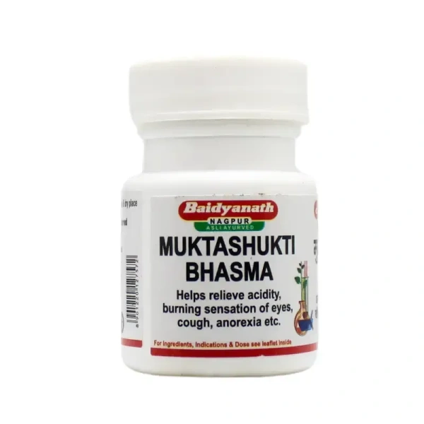 Baidyanath Muktashukti Bhasma is a herbo-mineral Ayurvedic formulation made from Mukta Shukti (Pearl Oyster Shell Bhasma). It is beneficial in managing digestive disorders, respiratory issues, and bone health. This bhasma is known for its acid-neutralizing properties, helping with acidity, heartburn, and ulcers. Additionally, it provides relief from cough, cold, and asthma and may support emotional well-being by reducing stress, anxiety, and anger.