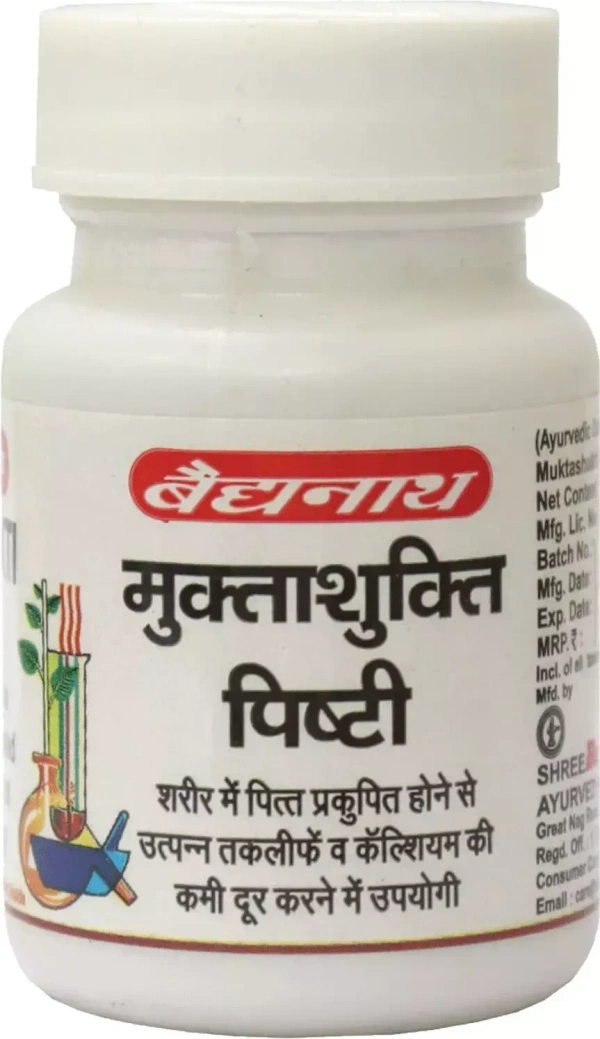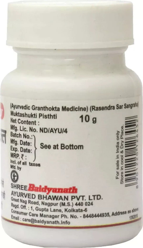 Muktashukti Pishti 10 G by Baidyanath is an Ayurvedic supplement that combines the medicinal properties of Muktashukti (pearl shells) with other ingredients. Baidyanath is a trusted brand known for its high-quality Ayurvedic products.