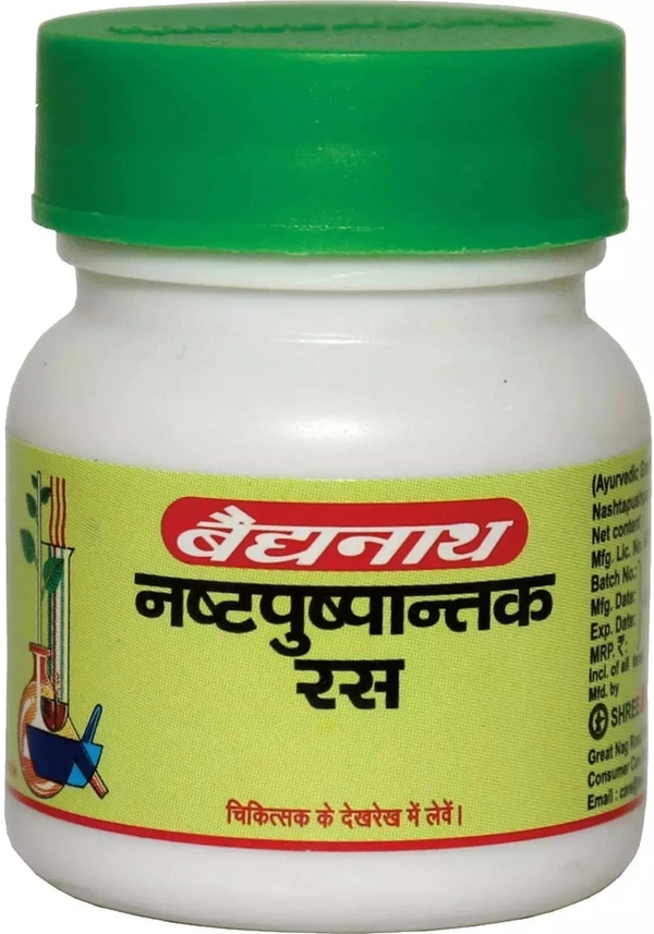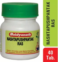 Baidyanath Nashtapushpantak Ras (40 Tablets) is an Ayurvedic formulation used to treat various conditions, particularly those related to reproductive health and vitality. It is often used to improve male reproductive health, enhance vitality, and support overall strength. The formulation contains a combination of potent herbal ingredients along with minerals, which are intended to restore balance in the body, particularly related to Vata and Pitta doshas.