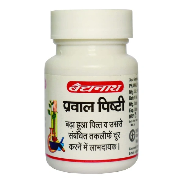 Baidyanath Prawal Pishti is an Ayurvedic preparation made from Prawal (coral), which is processed into a fine powder (Pishti) and used to balance the body’s pitta dosha and support overall health, particularly in conditions related to blood, bones, and digestive systems.