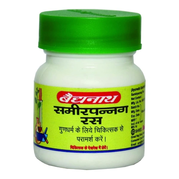 Baidyanath Samir Pannag Ras Powder is an Ayurvedic remedy formulated with a combination of potent herbal and mineral ingredients. This powerful medicine is known for its effectiveness in managing chronic conditions, particularly in treating ailments related to the joints, respiratory health, and overall vitality. Samir Pannag Ras is especially beneficial for patients suffering from paralysis, high blood pressure, and shortness of breath (dyspnoea). It is also effective in alleviating joint pain, rheumatism, and conditions like lumbar spondylitis (kati-stambha). The medicine is designed to help balance the body's doshas, with an emphasis on restoring the proper flow of vital energies. It is a carefully crafted formulation that should only be taken under medical supervision to ensure safety and effectiveness.