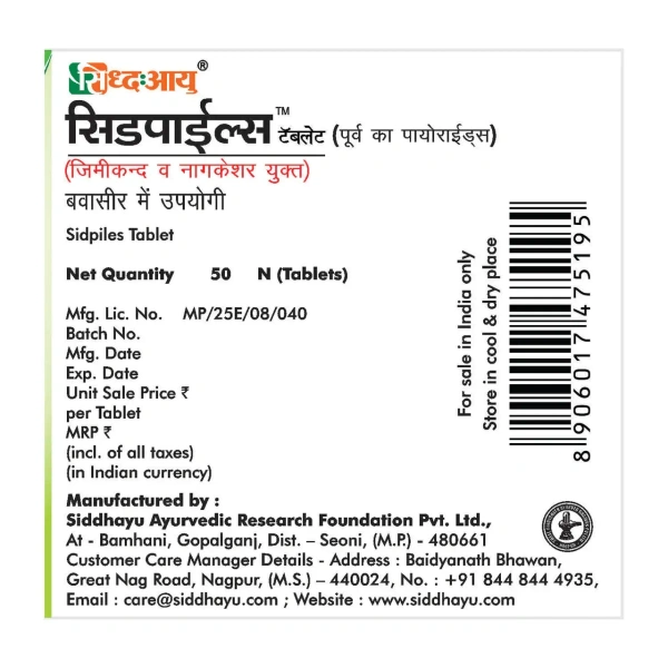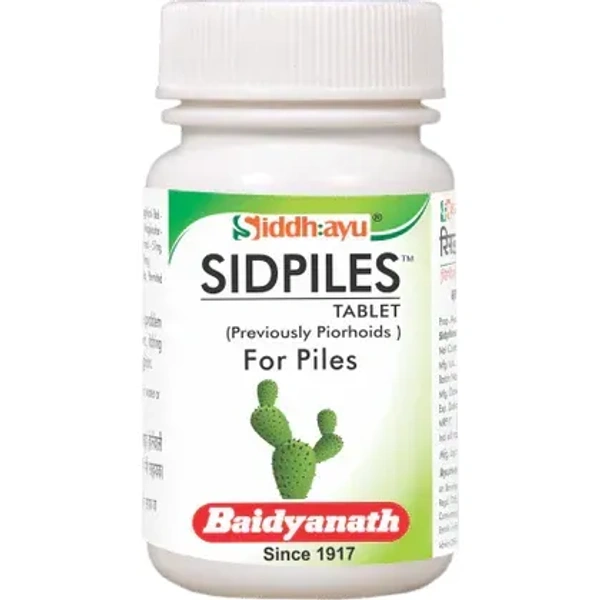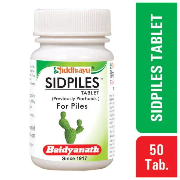 Sidpiles tablet is specially designed formulation for management of piles. It is a blend of highly effective herbal components of highest quality which acts as an anti-inflammatory and wound healing agent. Along with anti-inflammatory and wound healing properties, it has astringent, thrombolytic, stool softener, emollient and soothing action. It relieves spasm, itching and burning sensation related to piles (Hemorrhoids).