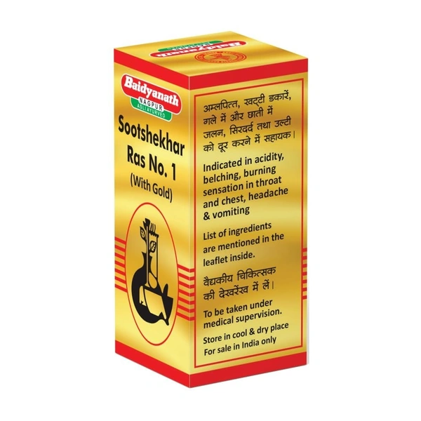 Baidyanath Sootshekhar Ras No. 1 with Gold is a potent Ayurvedic formulation primarily used to balance the digestive system, particularly for conditions related to acidity, indigestion, and associated discomforts. The presence of gold in this formulation is believed to enhance its therapeutic properties, promoting overall health and vitality.