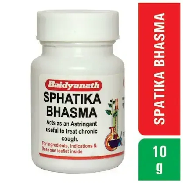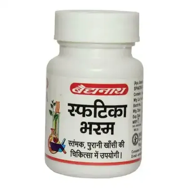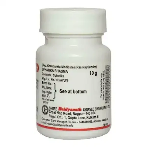 Baidyanath Sphatika Bhasma is an Ayurvedic formulation made from Sphatika (Alumina), which is a naturally occurring mineral that undergoes a special purification process (Bhasma preparation) in Ayurveda to enhance its therapeutic benefits. Sphatika Bhasma is primarily used for its detoxifying and healing properties.