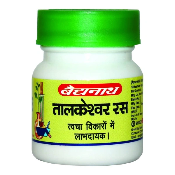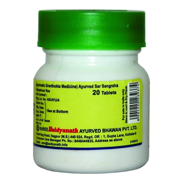 Baidyanath Talkeshwar Ras-20 Tab is an Ayurvedic formulation used in traditional medicine, primarily for detoxifying the body and treating various ailments, especially those related to digestive health and liver function. It is often used for its rejuvenating and tonic properties.