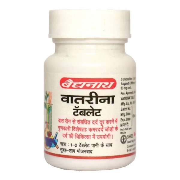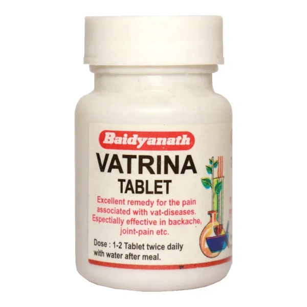 Vatrina is an Ayurvedic proprietary medicine containing potent herbs- suranjan (Colchicum luteum), ashwagandha ( Withania somnifera) and soanth (Zingiber officinale). Ashwagandha and soanth have anti-inflammatory properties. While suranjan is used for the treatment of gout. Vatrina Tablet is traditionally used in the management of Pain in vat diseases.