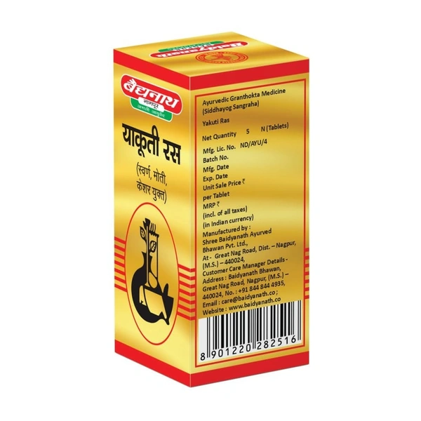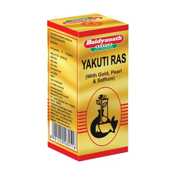 - 1 tablet of Baidyanath Yakuti with Gold, Pearl & Saffron is typically taken once or twice a day, as recommended by an Ayurvedic doctor or healthcare practitioner.