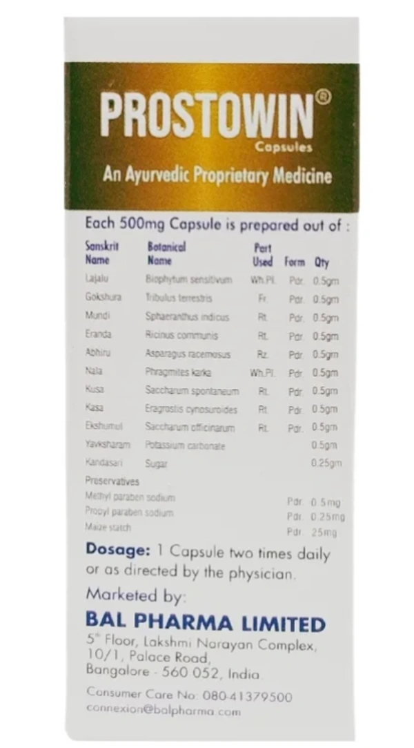 Prostowin Capsule is a dietary supplement crafted from natural ingredients to support prostate health, particularly in reducing symptoms of an enlarged prostate. It acts as a tonic for general and nervine debility, offering rejuvenating and aphrodisiac benefits. This supplement aids in managing prostate issues, improving urinary flow, and enhancing overall well-being.