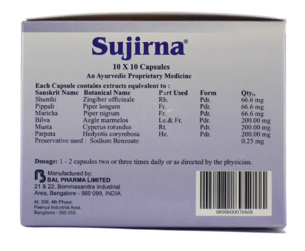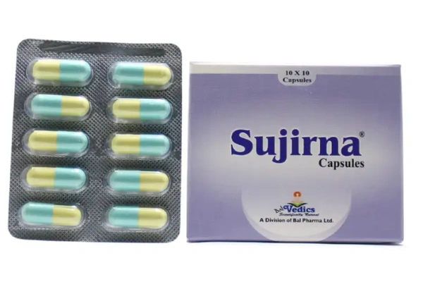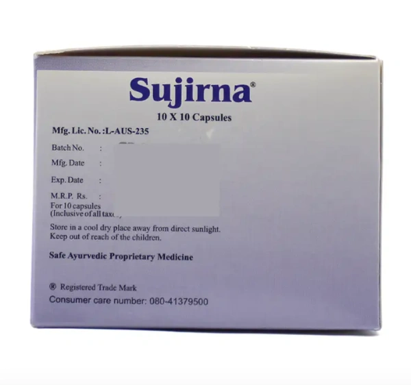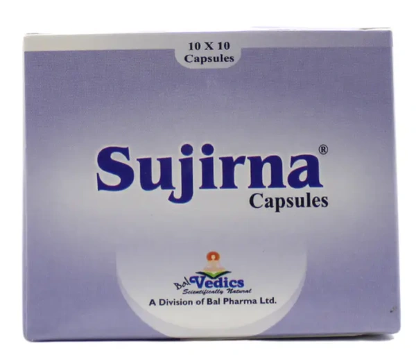 SUJIRNA Capsule is an Ayurvedic supplement designed to support digestive health and manage a wide range of gastrointestinal disorders. It helps with symptoms such as abdominal pain, belching, hiccups, nausea, vomiting, regurgitation, dysphagia, dyspepsia, diarrhea, and constipation. The combination of natural ingredients works to balance digestive functions, promoting overall well-being.