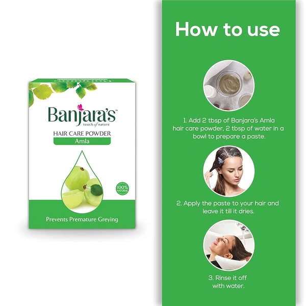 Banjara's Amla Hair Care Powder is a natural hair treatment made from high-quality Amla (Indian Gooseberry), known for its exceptional benefits in strengthening and nourishing hair. The powder is rich in vitamin C and antioxidants, helping to condition, cleanse, and revitalize hair. It works as a natural hair tonic, promoting scalp health, enhancing shine, and preventing premature greying and dandruff.